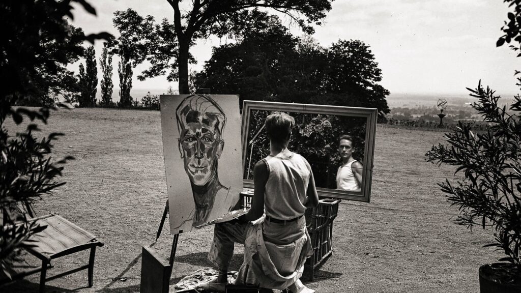 in questa fotografia Jacques-Henri-Lartigue mentre realizza un autoritratto con fotocamera e pennello