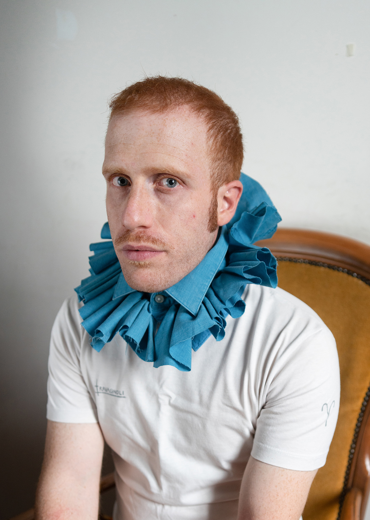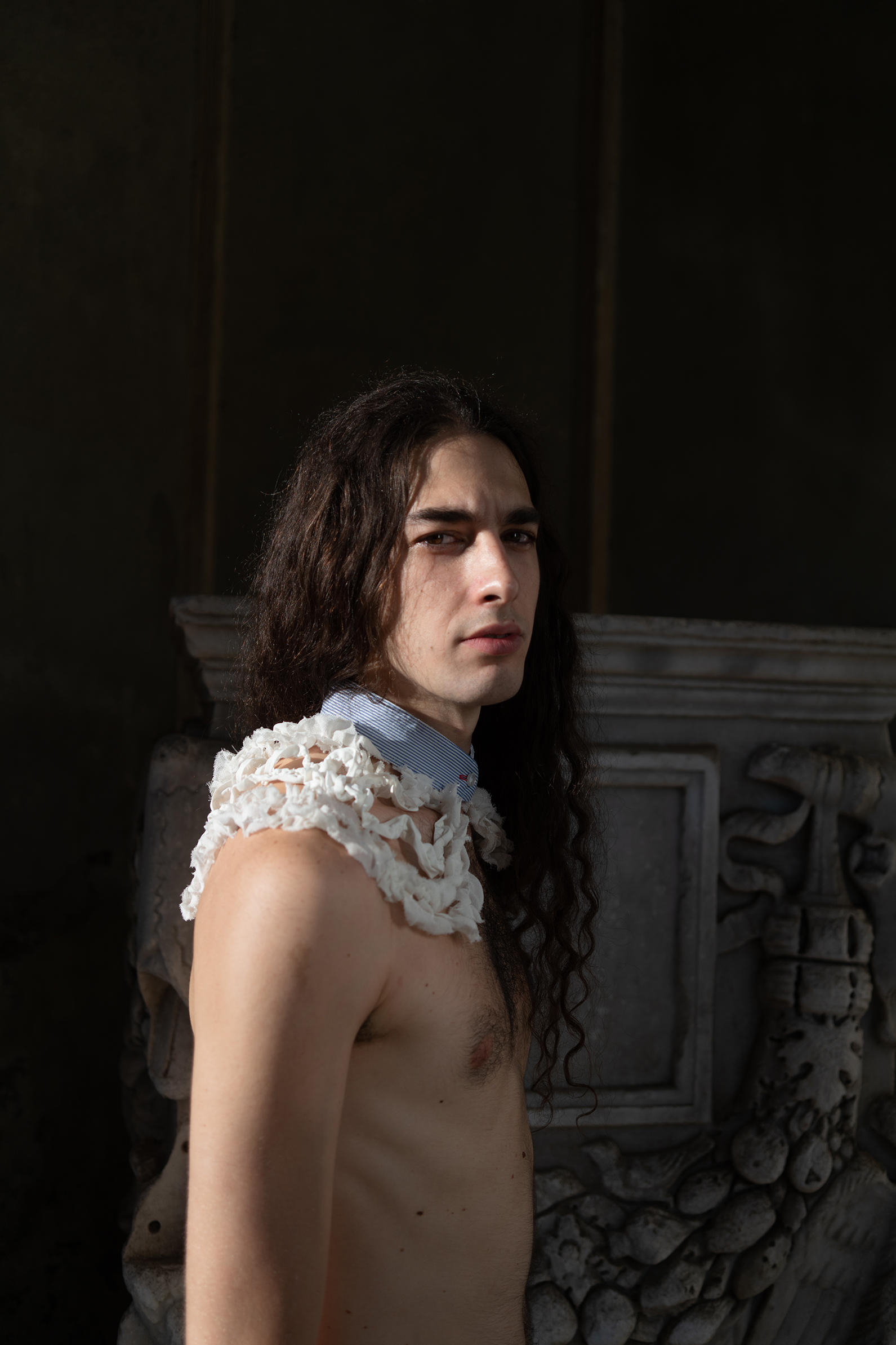 Natalia Diaz disegna ornamenti e, ispirandosi a Orlando, gioca con la definizione tradizionale di abbigliamento di genere, realizzando accessori e indumenti neutri dal punto di vista del genere che si animano quando chi li indossa posa per fotografie. In questo modo acquisiamo una nuova consapevolezza del potenziale potere metaforico e simbolico che si determina al variare del posizionamento degli oggetti e degli indumenti in relazione al corpo.